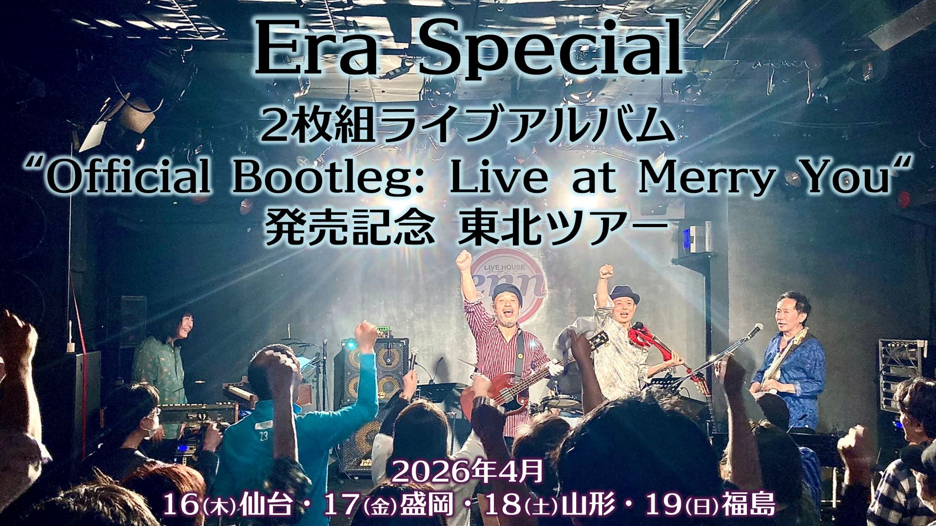 昨年の <Era Special 1st アルバム ”Gleams” 発売記念ツアー 東日本編>の熱狂も冷めやらぬ中、今年もEra Special 東北ツアーを敢行いたします! しかも、にゃんと、2025年の西日本ツアーの最終日、浜松 Merry You でのライブを全収録した2枚組ライブ・アルバム『Official Bootleg: Live at Merry You』のリリース発売記念ツアーとなります!!! 1st アルバム『Gleams』もスタジオ録音ながらライブ感溢れる作品になったと自負しておりますが、本作はメンバー全員が録音されていることを知らなかった(笑)ガチのライブ盤です。 日本で一番早くライブ盤を入手できるこのチャンスをお見逃しなく!!!! 続いて西日本ツアーも計画中です〜! お楽しみに〜!